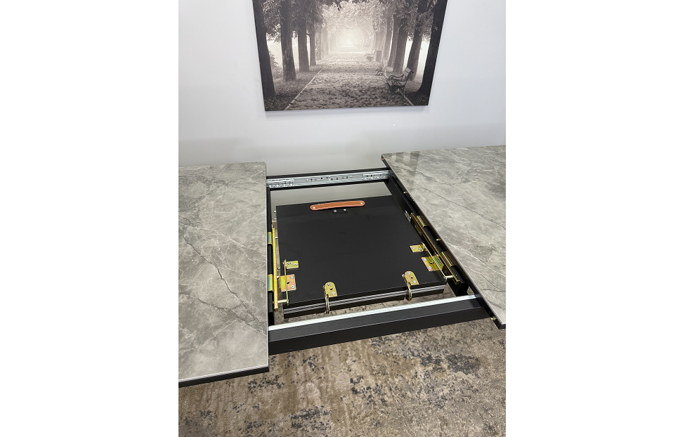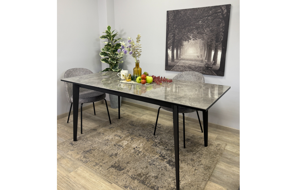 Стол обеденный Дега раздвижной KR1400 – стильный и практичный стол с керамической столешницей, которая отличается высокой прочностью и долговечностью. Каркас выполнен из стального профиля и окрашен в черный цвет, который гармонично сочетается с глянцевой поверхностью керамики.